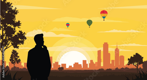 geometric, silhouette, man, sunset, balloon, tree, building, abstract, minimal, vector, modern, city landscape, sky, line art, graphic, sunrise, evening, nature, urban, creative, simple, sun, park, aesthetic, perspective, minimalism, polygonal, composition, relaxing, standing, scenery, peaceful, skyline, shadow, tranquil, outline, environment, stylised