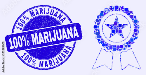 Geometric star award mosaic pictogram and 100% Marijuana seal stamp. Blue vector round scratched seal with 100% Marijuana message. Abstract concept of star award combined of round, triangles,