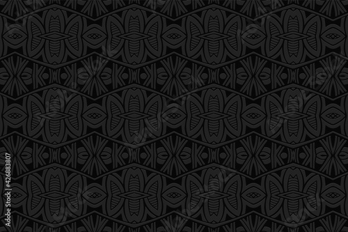 Geometric volumetric convex black background. Ethnic African, Mexican, Indian motives. Doodling style. 3d embossed national traditional pattern.