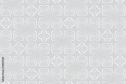Geometric white background. Volumetric composition with 3D effect of a convex shape. Ethnic relief pattern in the style of minimalism.