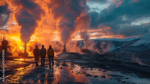 geothermal, power, plant, sunset, steam, cloud, sky, landscape, industrial, energy, factory, men at work, silhouette, water, ground, mountain, snow, horizon, orange, red, blue, dark, mist, fog, winter, cold, environment, nature, station, industry, electricity, natural, resource, renewable, production, human, source, emission, gas, smog, pollutant, turbine