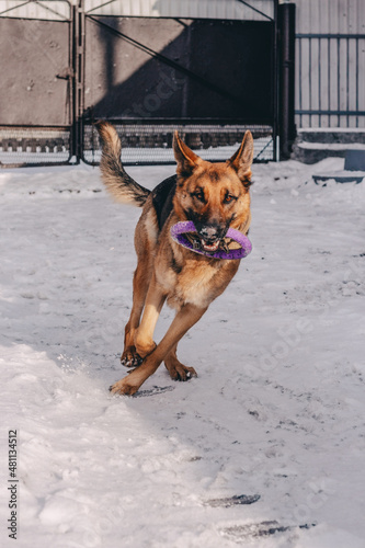 German Shepherd runs with a puller in his teeth. A dog runs around with a toy in the winter outside while playing. High quality photo