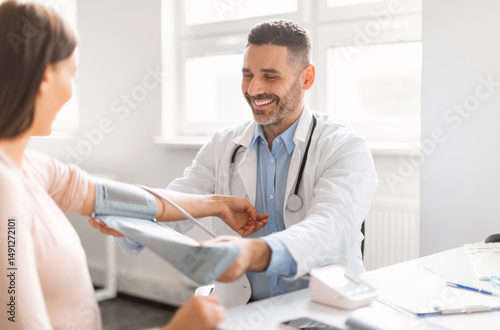 Gestational hypertension. Male doctor measuring arterial blood pressure of young pregnant lady using cuff, sitting in clinic office. Health care concept