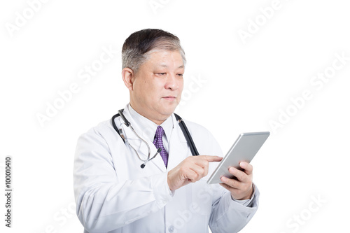 doctor, old, gesture, asian, hand, white, portrait, chinese, japanese, stethoscope, hospital, medicals, instrument, senior, man, tablet, finger, digital, face, expression, isolated, background, clinic, professional, uniform, health care