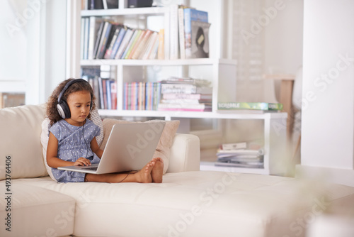 Getting her learn on. Shot of a little girl using headphones and a laptop while sitting at home.