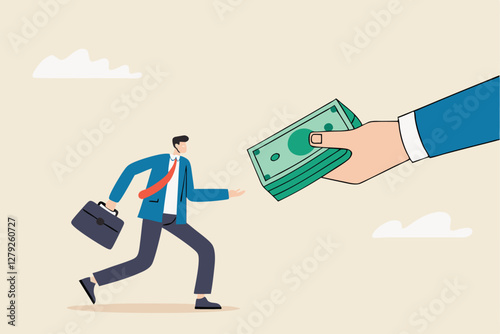 Getting paid, salary, wages payment or bonus, reward or employee benefits, tax refund or investment profit earning, loan or mortgage concept, business man hand giving money banknote to happy employee.