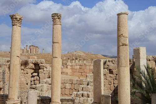 jordan, arabia, jerash, antique, city, latin, pillar, capital, temple, archaeology, heaven, cloud, blue, sun, shadow