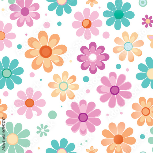 flower, pattern, pastel, colourful, seamless, background, white, dot, floral, design, texture, spring, summer, cute, pretty, happy, cheerful, bright, vibrant, delicate, feminine, romantic, soft, gentle, elegant, sweet, whimsical, artistic, illustration, graphic, wallpaper, fabric, textile, digital, print, artwork, image, photo