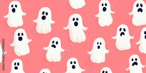 ghost, pattern, pink, background, skittish, halloween, cartoon, illustration, design, cute, character, expression, fright, fear, fun, festive, art, texture, wallpaper, decoration, playful, white, black, smile, frown, surprise, scared, happy, sad, creepy, cheerful, whimsical, joyful, animated, graphic, vector, seamless, repeat, print, textile, fabric, children, party, event