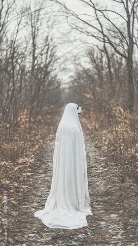 ghost, skittish, scarey, halloween, costume, white, sheet, forest, tree, path, wood, nature, autumn, fall, october, creepy, mystery, supernatural, spirit, paranormal, haunting, fear, dark, eerie, alone, lost, abandoned, haunted forest, nightmare, horror, background, vertical