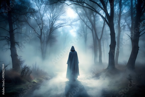 ghost, mist, fog, skittish, mysterious, aethereal, figure, silhouette, horror, supernatural, halloween, creepy, dark, shadowy, phantom, spirit, haunting, eerie, atmosphere, landscape, nature, timberland, tree, night, moody, atmospheric, fantasy, art