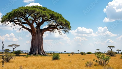 Giant baobab stands tall amidst sparse savannah vegetation , arid, ecology, grey