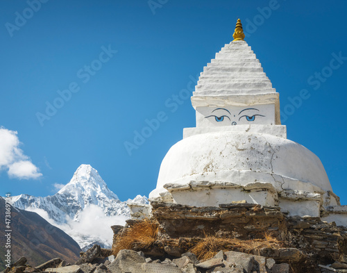 giant white buddhist stupa on the hill with view to blue sky and snowed summits with copy space