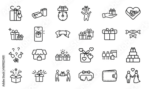 Gift and Celebration Icon Bundle – Present Boxes, Tags, Bows, Wallet, Shopping, Loyalty Rewards, Love, and Surprise Line Icons for Holidays, Events, and Ecommerce UI