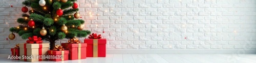 Gift boxes and a beautifully decorated Christmas tree on white brick wall with empty space for presents , present boxes, gift containers, simple arrangement