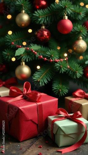 Gift boxes under the Christmas tree with ribbons and bows in different colors, berries, holly
