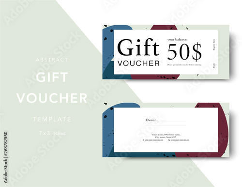Gift voucher card template. Modern discount coupon for shopping with abstract pattern. Modern fashion background design with information sample text. Coupon template for gift and shopping.