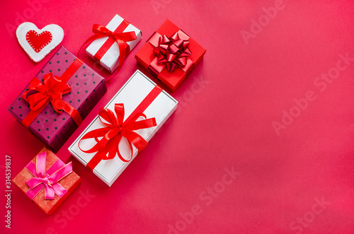 Gifts for Valentine's Day, Mother's Day. Multi-colored gift boxes with red ribbons and a handmade heart on a red background with copy space.