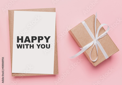 Gifts with note letter on isolated pink background, love and valentine concept with text happy with you
