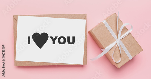 Gifts with note letter on isolated pink background, love and valentine concept with text I love you