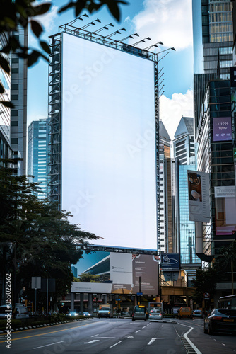 Gigantic Blank Billboard on a Busy City Street Surrounded by Modern Skyscrapers and Urban Jungle, Perfect for Advertisement and Commercial Display in Bustling Metropolitan Area