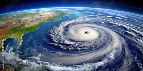Gigantic hurricane swirling above Earth illustrating effects of climate change