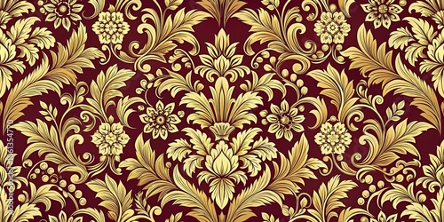 gold, floral, burgundy, pattern, design, intricate, ornate, elegant, luxurious, seamless, texture, vintage, background, wallpaper, decorative, abstract, swirl, motif, art, detail, rich, baroque, classic, traditional, aesthetic