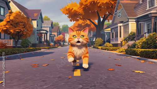 cat, ginger, running, street, autumn, fall, leaf, house, suburban, neighbourhood, animation, three-dimensional, cute, playful, happy, energetic, orange, yellow, brown, warm, sunny