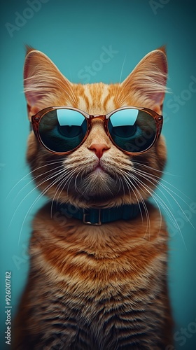 Ginger cat wearing reflective sunglasses, showing off cool attitude, fur detailed in orange stripes, blue background enhancing modern and trendy vibe