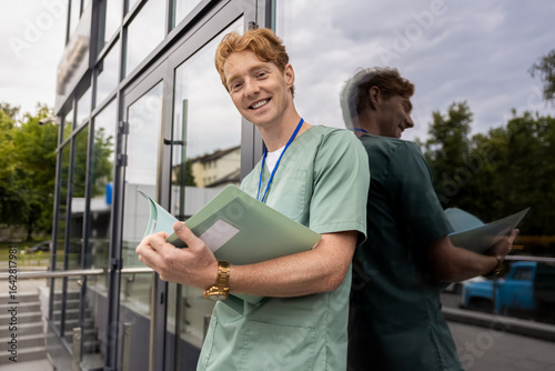natural light, document, modern, urban, occupation, uniform, health care, caucasian, man, labcoat, male, clinical, ginger, history, standing, scrub, outdoors, men at work, red hair, folder, young adult, glasses, clinic, badge, medicals, professional, lifestyle, medicine, hospital, confident, doctor, laboratory, patient