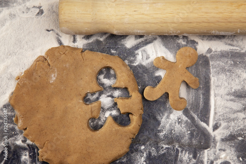 gingerbread, cookie, food, snack, treat, dessert, ginger, snap, sweet, baking, cooking, making, dough, cutter, shape, flour, mess, from above, flat, lay, man, man, person, woman, christmas, holiday, holiday, cutting, dark, countertop, counter, table, slate, blackboard, black