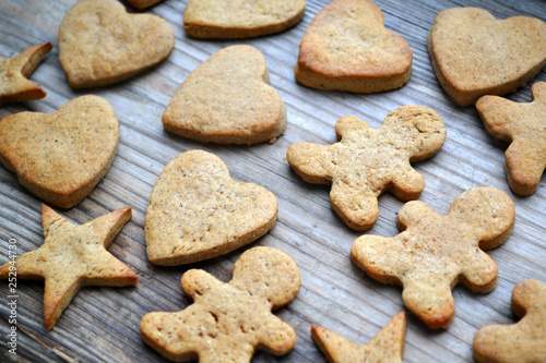 Gingerbread cookies in shapes of heart, star and man with cinnamon stick and ginger root on wooden table