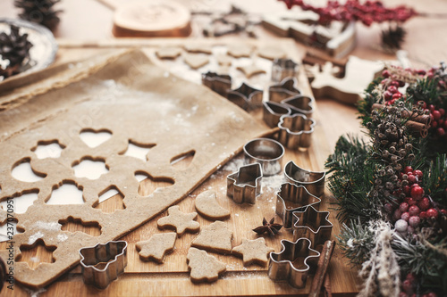 Gingerbread dough with metal cutters for christmas cookies on rustic table with cinnamon ,anise, cones, christmas decorations. Atmospheric stylish image. Making cookies.