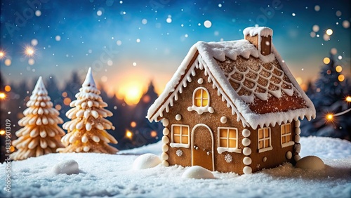 Gingerbread house covered in snow in a winter wonderland , Christmas, festive, holiday, baking, delicious, sweet, gingerbread