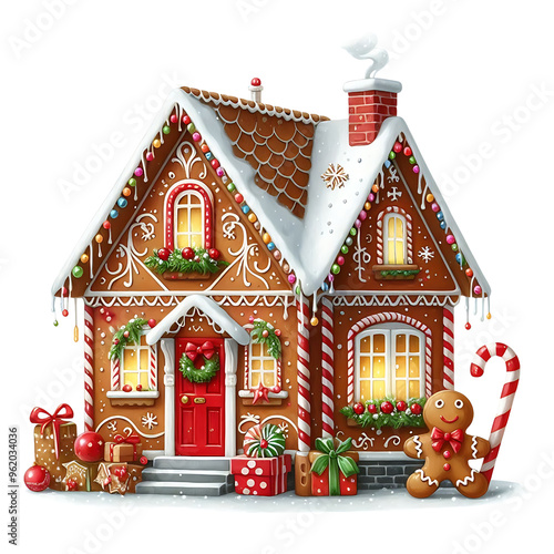 Gingerbread house decorated with candies, snow, and holiday gifts. Christmas decorations with gingerbread man on a white background. Holiday watercolor cut out design concept.