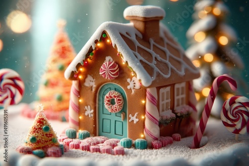 christmas, holiday, ornament, gingerbread house, candy, colourful, sweet, table, festive, decoration, dessert, closeup, food, treat, red, green, white, brown, candy cane, gumdrops, icing, winter, cosy, celebration, seasonal, tabletop, bright, sweet, banner, new, year, poster, card