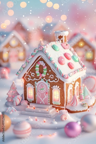 Gingerbread house in a snowy village, colorful decorations, holiday magic, 3D illustration