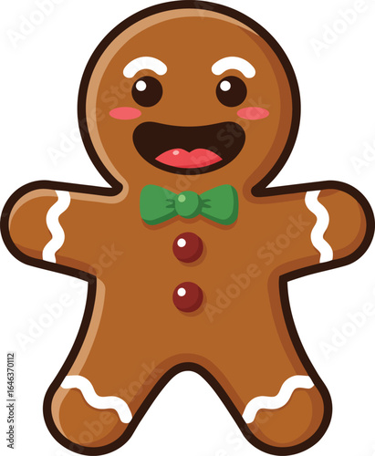 gingerbread, cookie, man, bow tie, green, buttons, red, sweet, dessert, treat, food, bakery, baked, dough, icing, decoration, celebration, holiday, christmas, winter, snack, cute, cartoon, smiling, cheerful, cartoonish, confection, ginger, sugar, brown, festive, vector, illustration, happy, joy, fun, smiling face, frosting, party, holiday season, baked goods, tasty, seasonal