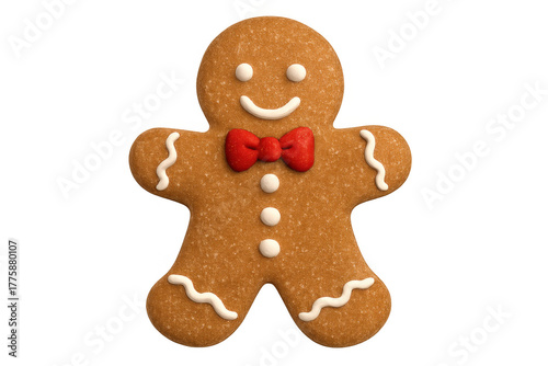 Gingerbread man cookie with red bow tie, enjoying christmas holiday baking, smiling sweet dessert, transparent background