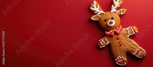 Gingerbread Reindeer Cookie with Icing Details on Vibrant Red Background Featuring Ample Blank Space for Holiday-Themed Text