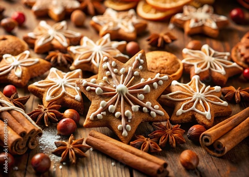 gingerbread, star, spice, nutmeg, cinnamon, star anise, walnut, almond, holiday, festive, baked goods, dessert, christmas, winter, cosy, traditional, culinary, food photography, miniature, texture, colours, arrangement, decoration, seasonal, warmth, favor, indulgence, treat, sweet, tasty, artisanal, homemade, unique, aromatic, delicious, confectionery, epicure, creative, beautiful, culinary arts, festive season