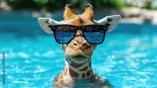 giraffe, swim, sunglasses, pool, stylish, animal, water, summer, fun, blue, quirky, splash, cool, relaxation, vacation, sun, wildlife, playful, unique, background, aquatic, eye, wild, leisure, mammal, blithe, charming, wearing, humor, whimsical, standing, environment, portrait, amusing, refreshing, exotic, adorable, head, enjoying, swimwear, cheerful, sunny, neck, charismatic, serene, dip, face, nature