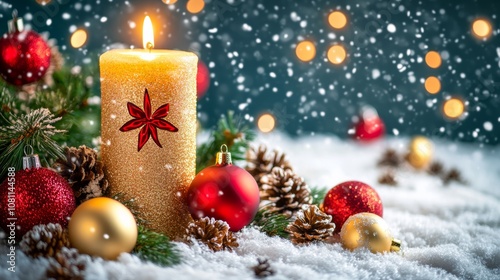 Giraffe-shaped candle adorned with a red bow amidst Christmas decor on snowy ground.