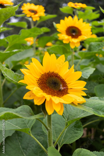 Girassóis em meio ao jardim com uma abelha no centro. As pétalas amarelas vibrantes e o fundo verde exuberante evocam uma sensação de verão