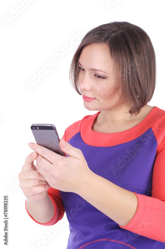 adult, appearance, background, beautiful, blue, brunette, businesswoman, camera, caucasian, mobile phone, mobile phone, chatting, cheerful, communicating, communication, copy, cute, fashion, female, finger, hair, hand, happy, isolated, joy, length, looking, mobile, modern, person, phone, pretty, professional, secretary, shot, smile, smiling, text message, studio, talking, white, woman, woman, year, young