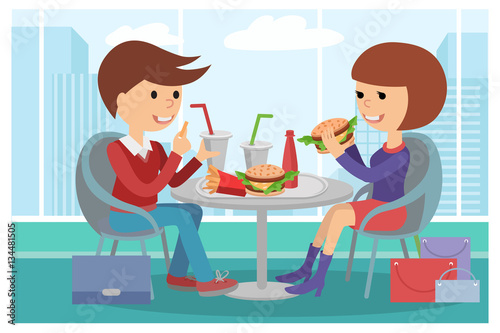 Girl and boy eating fast food. Vector illustration of a people at table with sandwiches drinks.