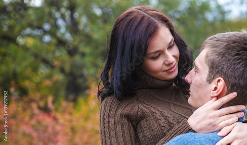 girl at the hands of Man. A loving couple walking in the autumn park.