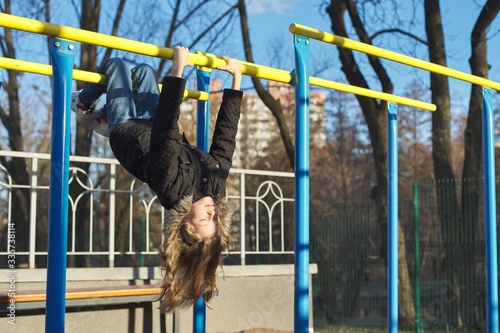 Girl child hanging upside down on outdoor sports playground with eyes closed