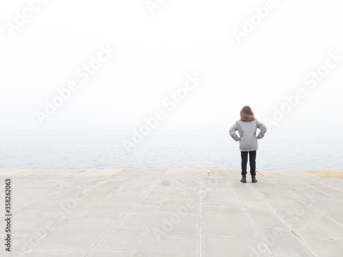 Girl child looking at grey distant horizon on a ocean foggy day.