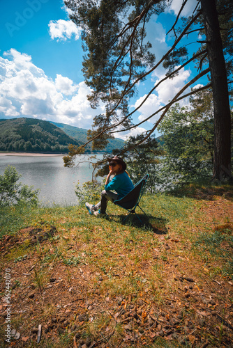 woman, summer, travel, nature, beautiful, forest, relax, lake, leisure, young, female, camp, tent, sitting, happy, chair, girl, adventure, background, lifestyle, green, person, blue, view, portrait, caucasian, outdoors, folding, fresh, small, sky, freedom, digital, vacation, soft, tour tourism, tree, man, landscape, camera, people, holiday maker, asian, sharpened, look, smiling, park, wood